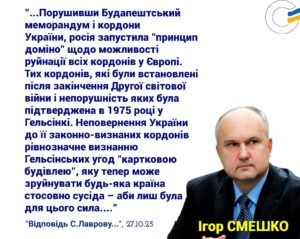 “Без виконання взятих на себе зобов’язань згідно з принципами Заключного акта НБСЄ (994_055) поважати незалежність і суверенітет та існуючі кордони держави, жодна країна не захоче відмовлятися від ядерної зброї в обмін на безпекові гарантії”, саме про який і попереджав Ігор Смешко.