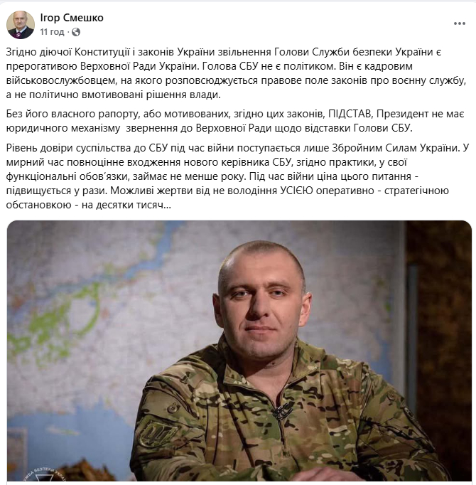 «Згідно з чинною Конституцією та законами України, звільнення Голови Служби безпеки України є прерогативою Верховної Ради України. Голова СБУ не є політиком — він є кадровим військовослужбовцем, на якого поширюється правове поле законів про військову службу, а не політично вмотивовані рішення влади.